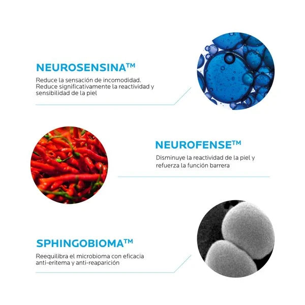 reequilibra el microbioma con triple eficacia reparadora, alivia la piel inmediatamente, reduce el picor. suaviza las irritaciones de la piel. Con eficacia antienrojecimiento y antirecaída Tratamiento diario que alivia de forma intensa y duradera las molestias de las pieles sensibles y alérgica.